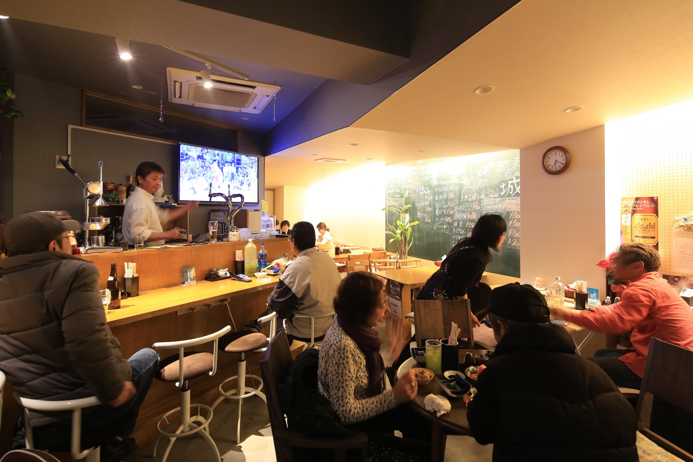 高島平の寄合所兼居酒屋の計画。 高島平は1956年に日本住宅公団が土地を買収しマンモス団地を建設して以来、山手線駅への接続の良さから、多くの若者が住む新興住宅地であった。その子供世代が都心へ移り住む事によって、現在では住民の約半数が65歳以上という深刻な高齢化が進んでいる。 そんな状況の中、施主夫婦の奥さんは電気屋を経営しながらお店の一部を地域に開放することで、住民の会話や習い事の場所を提供したり、遠出の出来ない高齢者のために様々なお取り寄せを行うなど、地域のコミュニティを繋ぐ活動を行っていた。こうした活動を本格化するために、旦那さんが経営する居酒屋の昼間の閉店時間を有効活用し、地域の寄合所にできないだろうか?というのが夫妻と共に構想したストーリーである。 限られたスペースの中で二つの用途を成立させるために、まずそれぞれの用途に必要となる設えを左右の壁に振り分け、天井高を変化させることによって寄合所としてのアットホームな雰囲気と居酒屋らしさを共存させる事を考えた。さらに、居酒屋のカウンターと寄合所の窓辺カウンターを対角に設え、全体に囲みを作る平面構成とする事で、異なる空間でありながらも時間帯によってお互いの空間が拡張し、一体的な空間としても使えるような計画とした。時間帯をずらして異なる取り組みが展開されるこの施設は、普段は出会わない人々のコミュニケーションを促進し、住民同士を結びつける、地域社会の核としての役割を担っている。