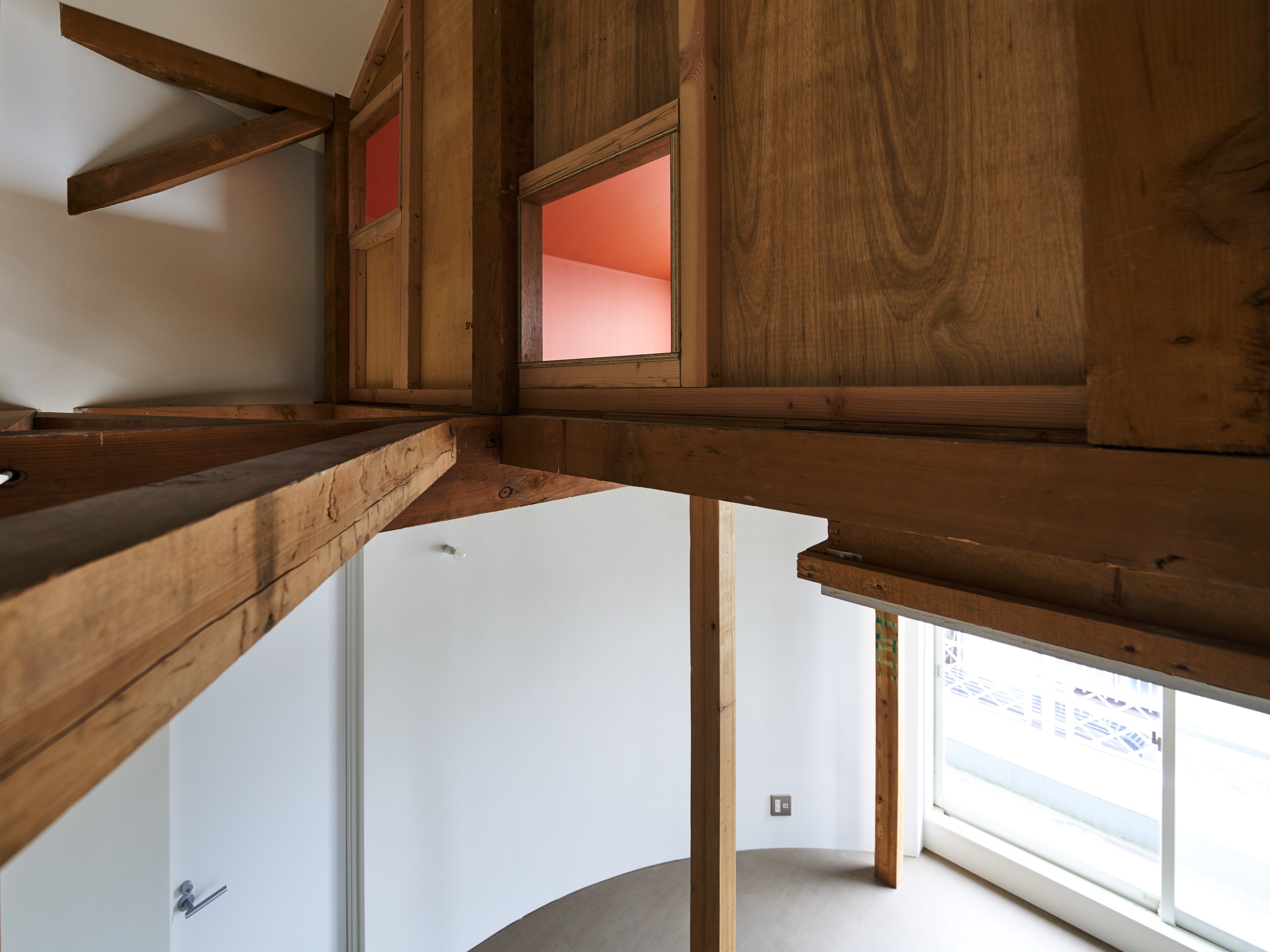 二階のシェアハウスでは、共有部を大きくとり、残りの部屋をベッドがおけるくらいのサイズに小さくするために、共有部の壁を風船を膨らますようにどんどん大きくしていった。すると、柱梁や屋根裏の小屋状の軸組が現れたので、その作業はちょうどいいところで止めた。また、シェアハウスとして気兼ねなく使い倒してもらうように木部の仕上げは荒々しいままとし、むしろ補強のためにせっかくいれた新規の材は同じくらい汚した。小屋は構造補強を行い耐震要素にもなっている。さらに耐震補強をしたにもかかわらず、猫が上空を飛び回れるように、屋根裏部屋から近い梁に向けて構造が許す限り開口を開けた。まさにキャットウォークである。