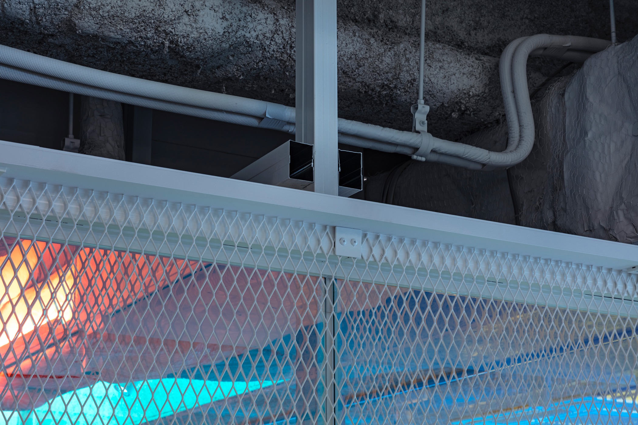 現象と社会構築を重ねるインテリアデザイン パナソニックのFUTURE LIFE FACTORYのインテリアデザインをツバメアーキテクツで担当した。この部署ではこれからの生活におけるデザインとはそもそも何かといったことを考える、いわばメタデザインとも言うべき領域を扱っている。 従ってインテリアデザインとしては、歴史ある組織体において未来に向けた余白ともいうべき空間がまず求められていると解釈し、文字通り余白の空間をオフィスの半分くらい取ることから考えた。余白の空間では社外のアーティストを招いたアート展示や、積極的なコラボレーションワークを行うギャラリー機能が想定された。 次に考えなくてはならないのは〈余白の空間〉と〈執務空間〉の境界面のデザインである。様々な矛盾する条件を調整し、そこで起きる反応のようなものを空間に現象させることを考え、それをこの空間の背骨のように位置付けることにした。 具体的には、間仕切りを単なる壁では無く、ある種の柱間装置として捉え、〈ギャラリー壁、情報セキュリティ・防犯、遮音、構造体、収納、照明〉といったいくつかの”配慮”に分解して考えはじめた。 それらを〈コンセント、エキスパンドメタル、飛散防止・偏向フィルム、ガラス、スタッド、スチールラック〉といった素材に一つ一つ置き換えてレイヤー状に重ねた。 そうすると配慮の置き換えられた複数の素材同士が、時間の経過と共に自然と関係し合うことになる。 例えば、世に出る前のモノと世に出たモノのシルエットが重なり、ガラスにはエキスパンドメタルの裏側が映り込み、実像と虚像が重なることでモアレを起こす。そして、そのエキスパンドメタルにはアーティストの作品を結びつけられたり、吊るされたディスプレイの配線がメッシュ越しに彼方此方へ張り巡らせられる。そして太陽の位置によって光の具合もドラマチックに変わる、といった具合だ。 またその他の部分はモノトーンとし、陰影が出るように各所取り合いを調整し、その陰影の中に配管や配線が取り込まれていくようなディテールとしている。 物理現象を写し込み、重ね、さらに組織体としての新たな活動や社内外のコラボレーションを促す社会構築的な役割をも持つインテリアデザインの提案である。