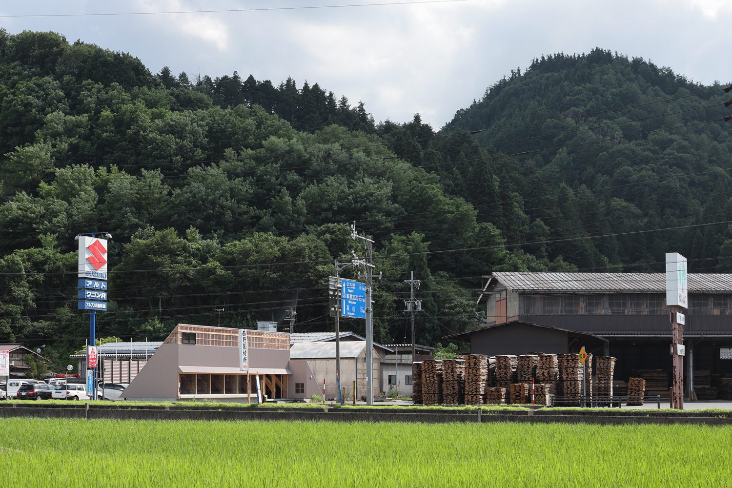 飛騨高地の北部に位置する飛騨古川は、河川に沿って細長く伸びる盆地の中にあり、山々に囲まれたまちからは、常に視線の先に森が見える。飛騨市は面積の93.5%が森林、そのうち68%が広葉樹天然林である。一方、飛騨でつくられる家具の多くは、外来材が使われている。平均直径が26cmと細く、樹種が多様で安定供給ができない。こうしたことが障壁となって、身の回りの資源が手付かずになっている。予てから、この森の広葉樹活用に取り組んできた施主は、森とまちの端に位置する製材所の中に、活用を促進するための拠点をつくることにした。建築はもちろん広葉樹で建て、その可能性を体現できる場所にしたい。そのために森に入って木を選ぶことから始め、製材の各工程に関わりながら、都度、利用できる材の条件に合わせて設計を調整していくプロセスで進めた。