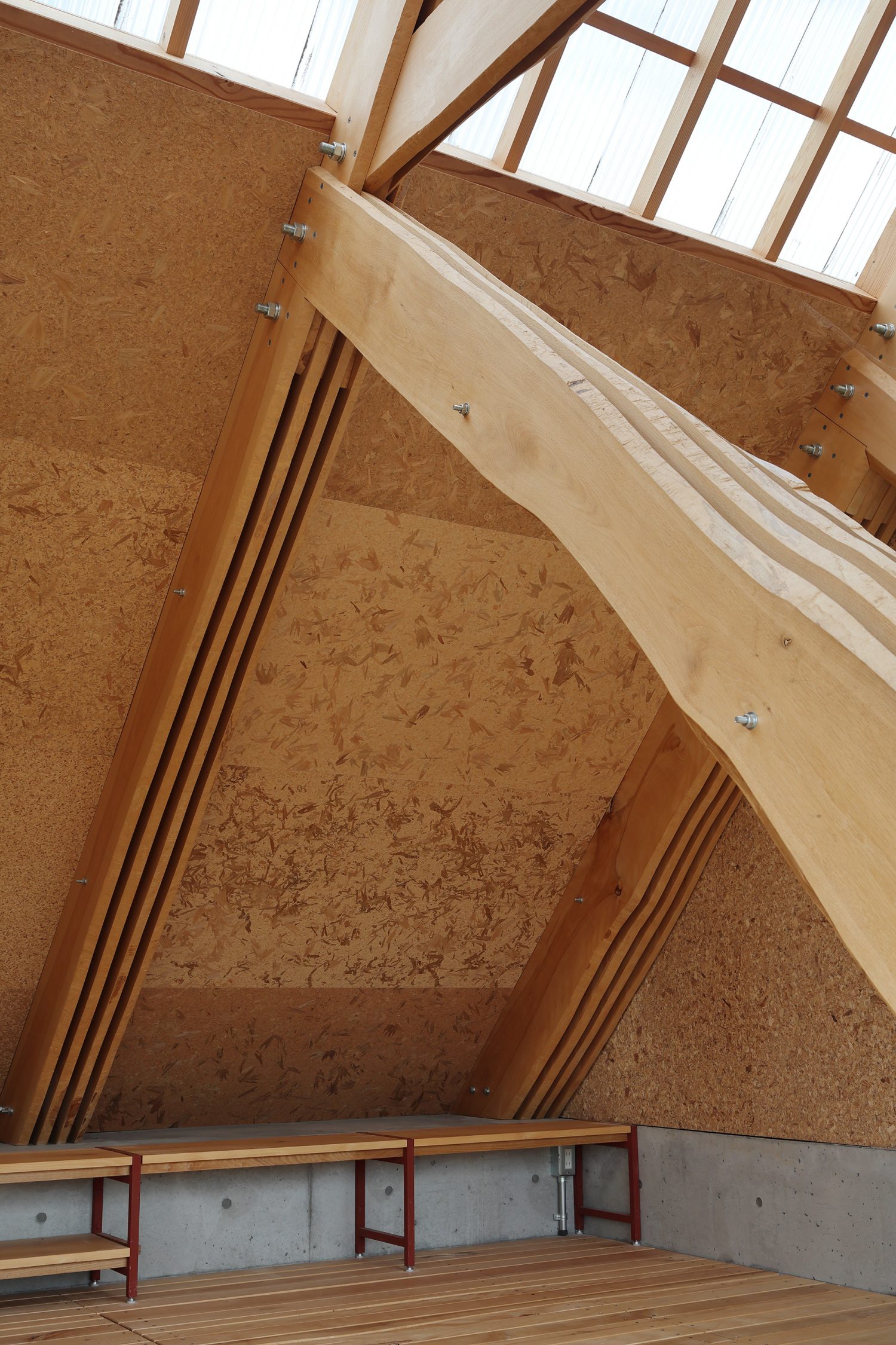 さまざまな樹種が混ざり、また耳を残した架構には一つとして同じものがない。目に映る森の木から考えることで、森の賑やかな環境をそのまま体現した特徴的な空間が生まれている。ここに訪れる人が、広葉樹の可能性に触れ、さらなる新しい活用が見出されることに期待している。