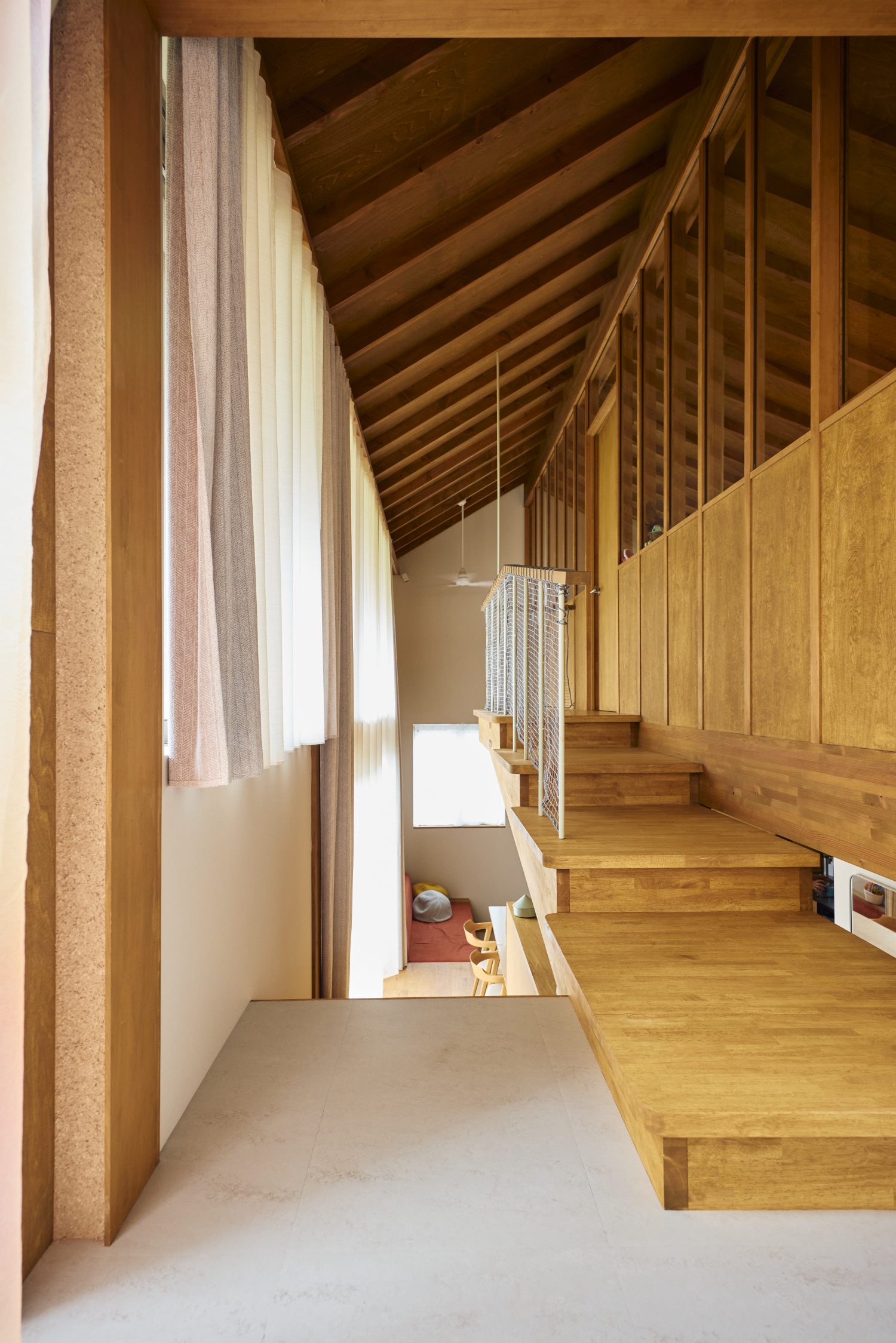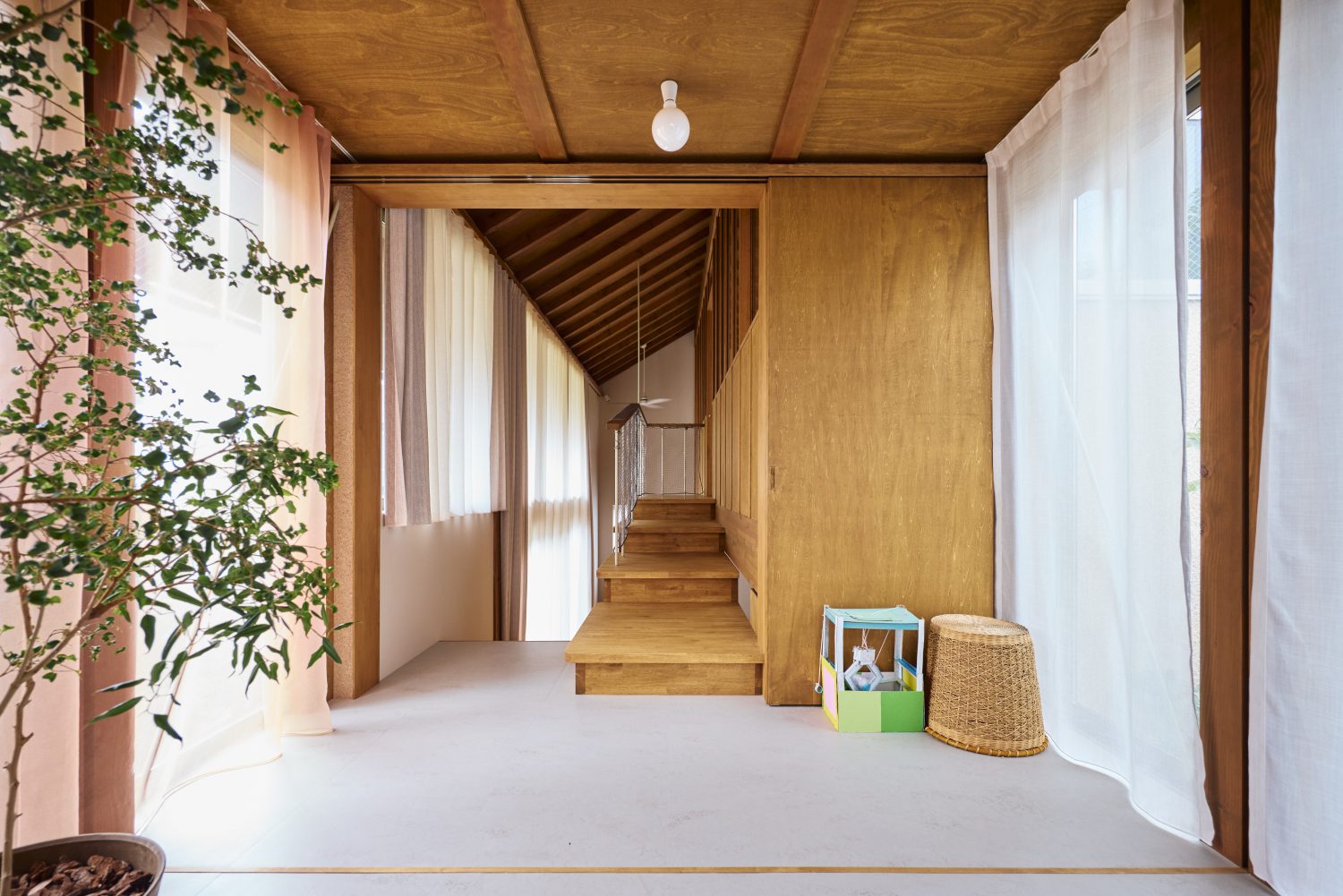 さらに、全体の構成に対して追記される、ライフスタイルに対応した間取りや設えというのはほとんど依頼時の「暫定」であるから、2棟の内部に配されるエレメントは可動で仮設的なものも含まれる。子供部屋としてしばらく使いそうな母屋2階は再編可能な間柱のような壁とした。その割り方に自由度を残すために、吹抜けの階段は母屋2階の中央に到達すべく、天井から吊られブリッジが延長したようにニョキッと吹抜けに顔を出す。またブリッジには壁はつくらず引き戸にしており、周辺領域とセットで別の用途を喚起する。ブリッジが室のような広さをもつことと相まって、窓を開ければインナーバルコニー、窓を閉めれば母屋2階から連続した子供の遊び場、引き戸を閉めればオンライン仕事場、南側の引き戸を閉じ寝室の引き戸を開ければ寝室の拡張といったように、日常生活にも分岐点を増やし、早速楽しく使われている。