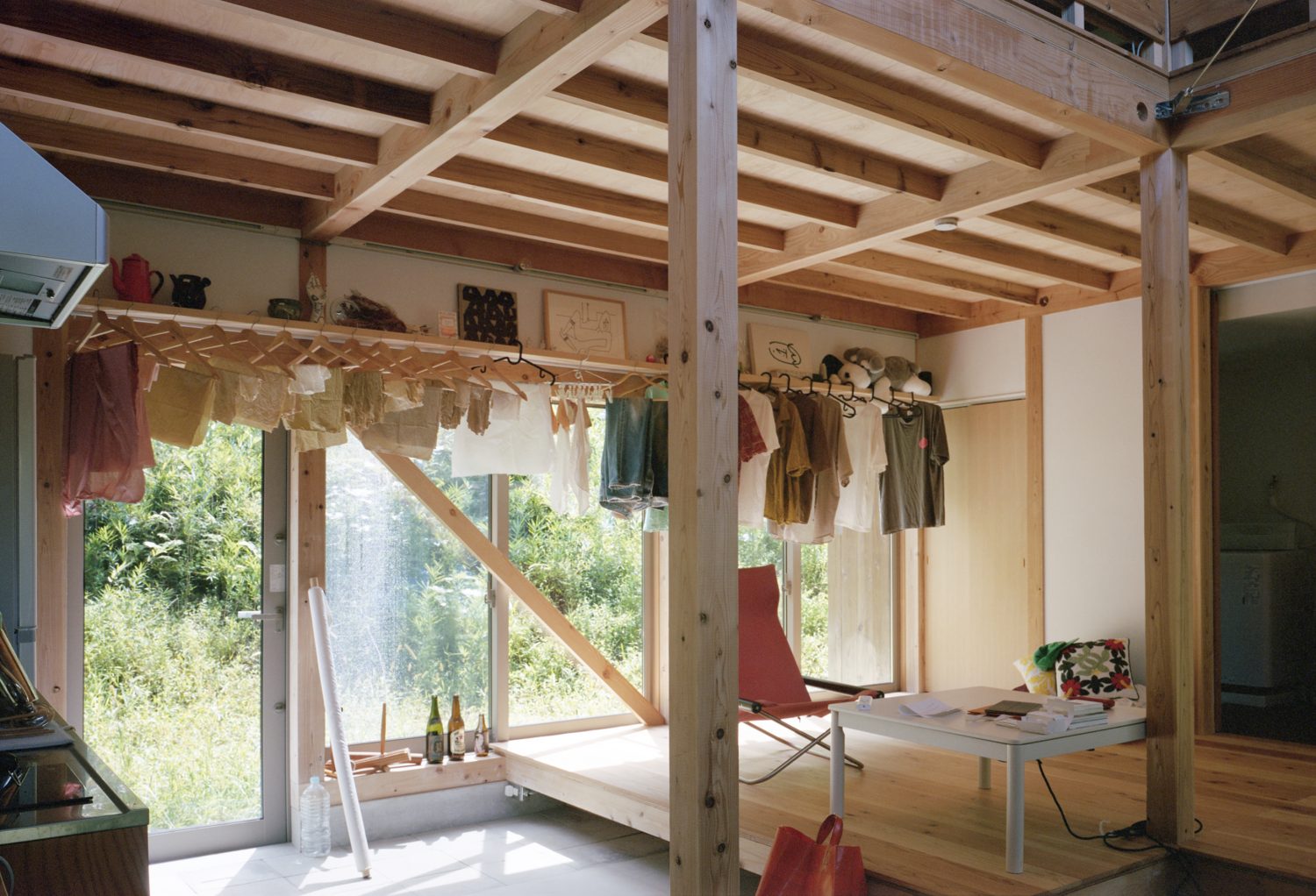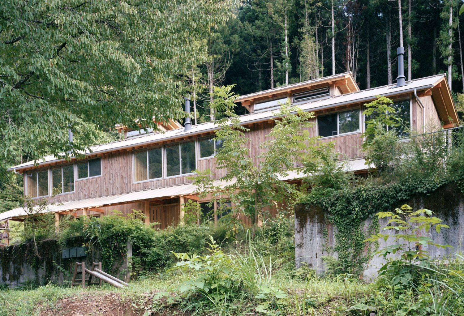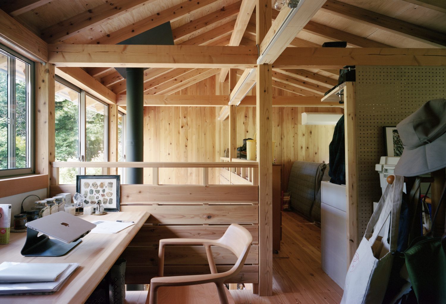長屋には3世帯が仮住まいで暮らす。ここでは移住を一度きりの決断ではなく、時間をかけて進むプロセスとして捉え、居住者は2~3年かけて、都市的な暮らしと農的な暮らしのバランスを探る。そのため、建築のつくり方は、誰でも真似しやすく、藤野の環境と向かい合ったつくりを目指している。具体的には1階の板間と土間を半々の面積とし、土間を屋外から続く作業や保管、団欒の場として使えるようにした。冬季は氷点下となることも多いことから、入口に置かれた薪ストーブを囲むように板間を設け、ちょっとしたやりとりは家の奥に入らずともできるようにした。2階は1,820mmスパンで中間梁を梁下1,900mmに抑え、家族構成や住まい方によって改変しやすい寸法としている。北側斜面に位置し、湿気が多いため、調湿性能のある漆喰を採用し、煙突効果で換気を促す計画とした。