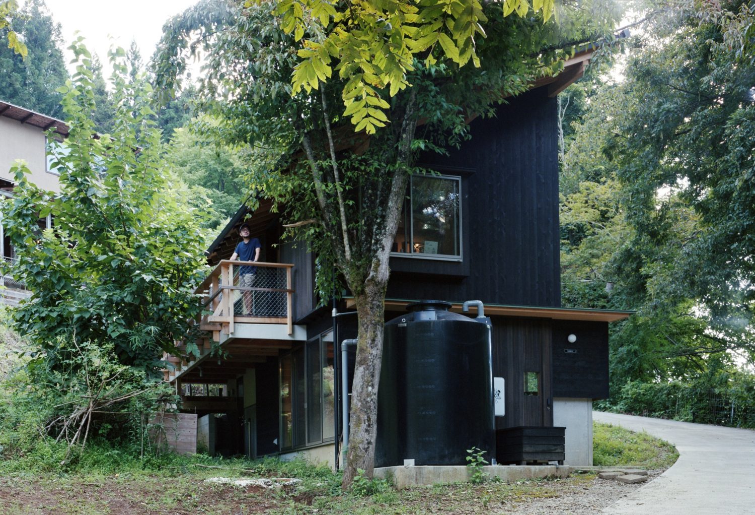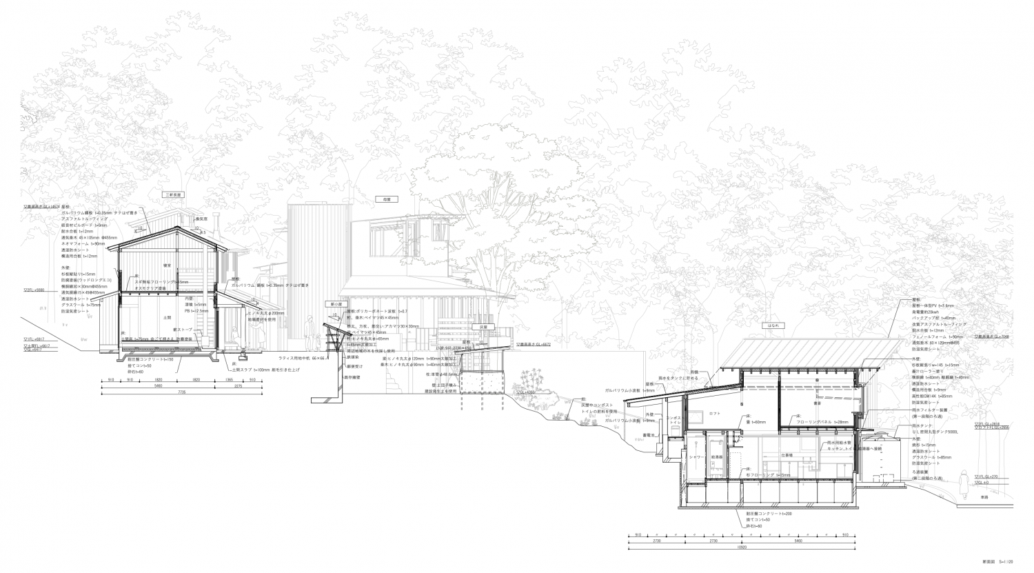 はなれは住民の仕事場であり、短期間の来訪者も滞在できる。1階の外壁は地域の焼杉経験者と施工者から三角焼きとバーナー焼きを教わり、設計者も材料づくりに参加した。2階は木材の匂いを抑えたり、カビの抑制が期待できる墨汁塗装としている。虫村では地域でよく見られる材料を各棟で用い、なるべく多様な仕上げとすることで、仮住まいの住民が経年変化を確認し、移住の参考にできる計画とした。また、太陽光パネル、蓄電池、雨水タンク、コンポストトイレを導入し、オフグリッド化を図った。自然エネルギーは恩恵も大きいが、常に十分な供給が得られるとは限らない。足りない時には使い方を見直し、他者と調整しながら暮らす必要がある。一見不便なこの状況は、供給に限りがあることによって、普段のエネルギーの使い方を改めて考え、私たちがエネルギーをどのような条件のもとで得ているのかを見つめ直す、ひとつのきっかけとなることを目指している。村全体の玄関にあたるはなれをオフグリッドとすることで、そうした暮らし方や感覚を、訪れる多くの人がより身近に感じられることも意図している。異なるグループが同時に使用できるよう、入口はGL+270mmとGL+2,820mmの2箇所に設けている。